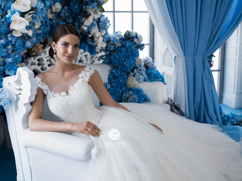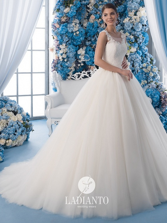 Роскошное пышное свадебное платье. Вырез корсета в форме сердца. Корсет полностью выполнен из кружева макраме. Вырез майки овальный, используется тончайшая сетка с эффектом приспущенного плеча. Спинка на молнии. Юбка очень пышная со шлейфом.