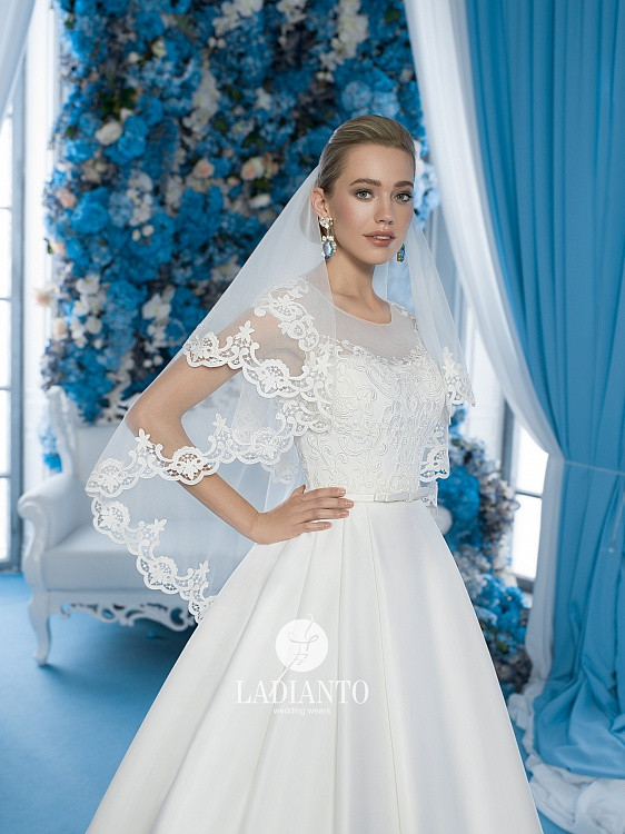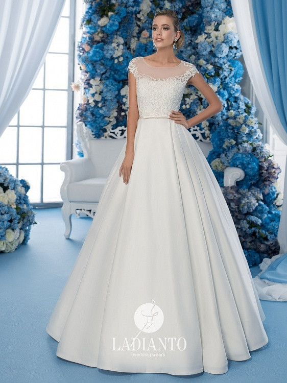 Свадебное платье А-образного силуэта, отрезное по линии талии. Юбка из атласа с небольшими складками, со шлейфом и карманами. Корсет расшит кружевными элементами, майка со спущенной линией плеча, талия декорирована тонким пояском. Спинка формы «капелька» выполнена на шнуровке.