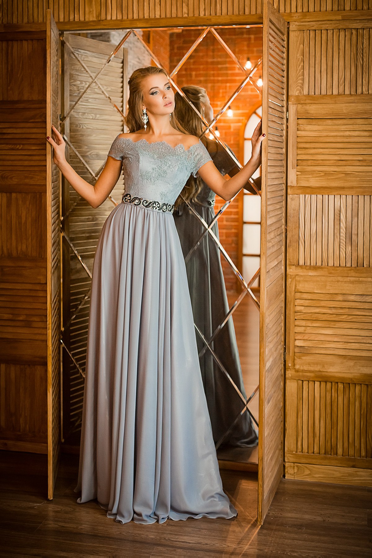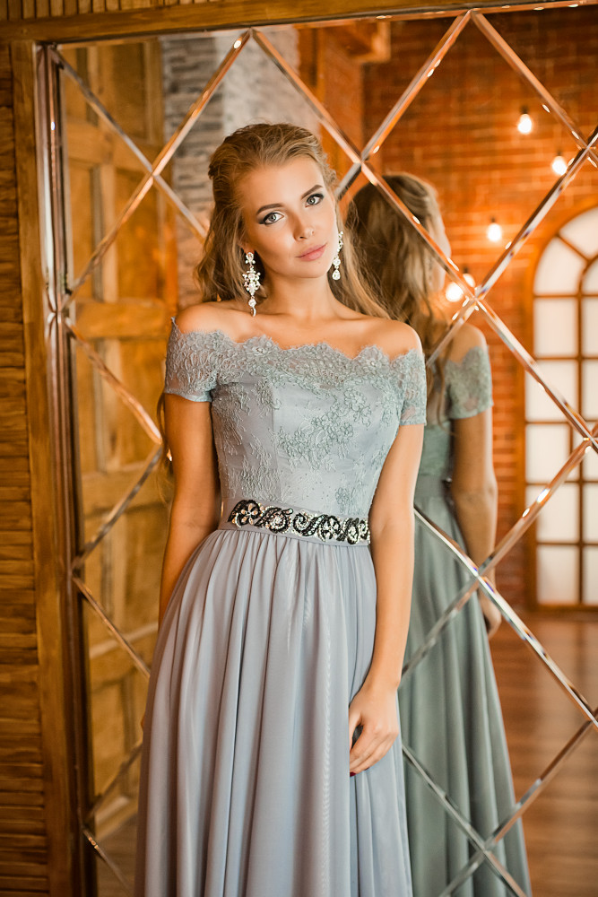 Платье прямого силуэта из атласа и шифона. Корсет украшает кордовый гипюр. Корсет со встроенным бюстье и фиксирующей резинкой под грудью. Пояс украшает вышивка бисером и стразами Swarovski. Застежка молния и фиксирующая шнуровка.