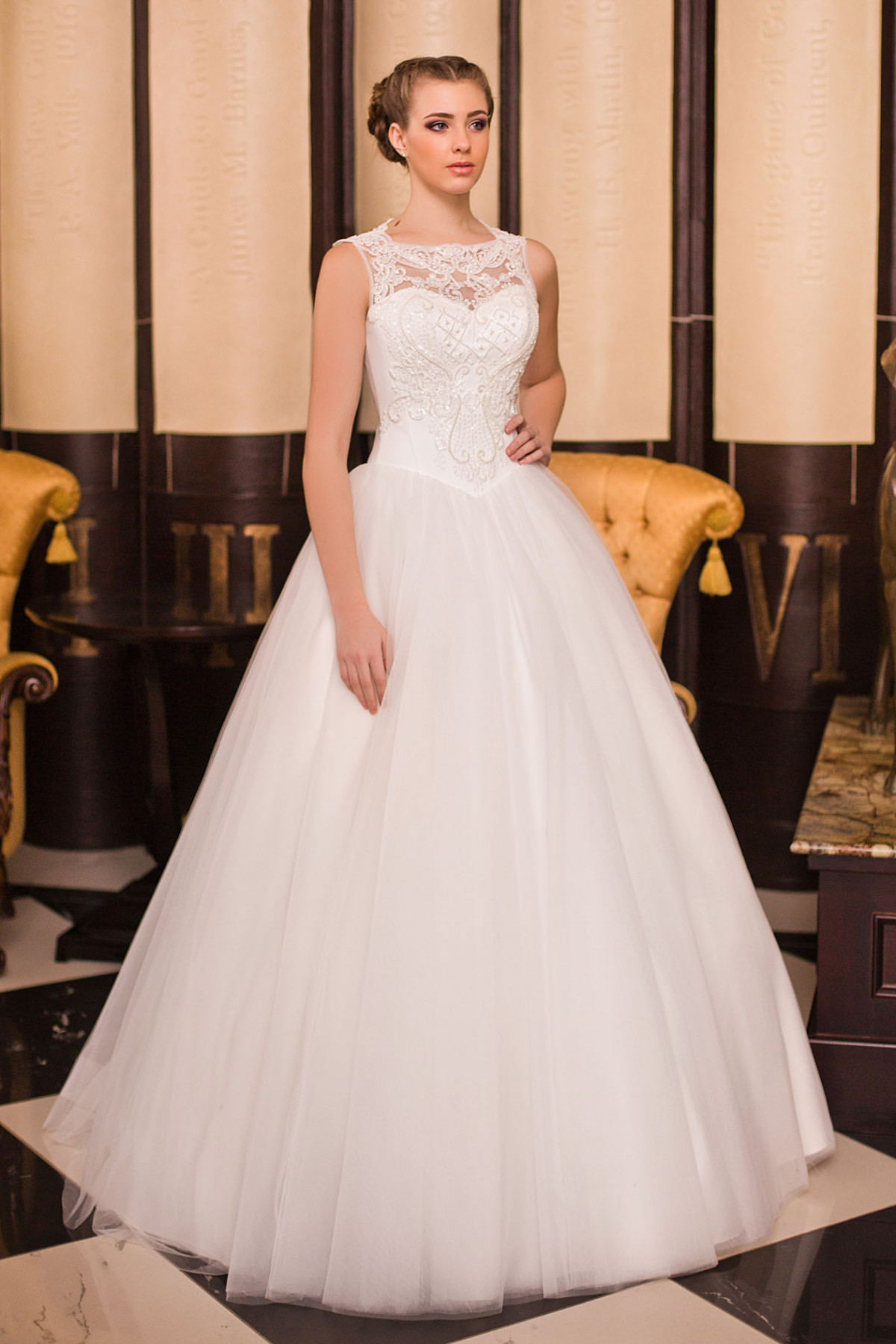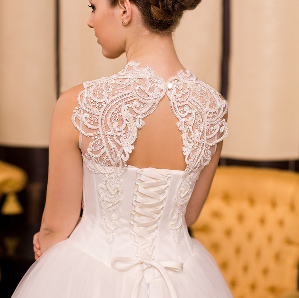 Великолепное свадебное платье. Заниженный корсет украшает необычайной красоты вышивка бисером, переходящая на плечи и фигурный вырез спинки. Юбка - легкая многослойная, с небольшим шлейфом.