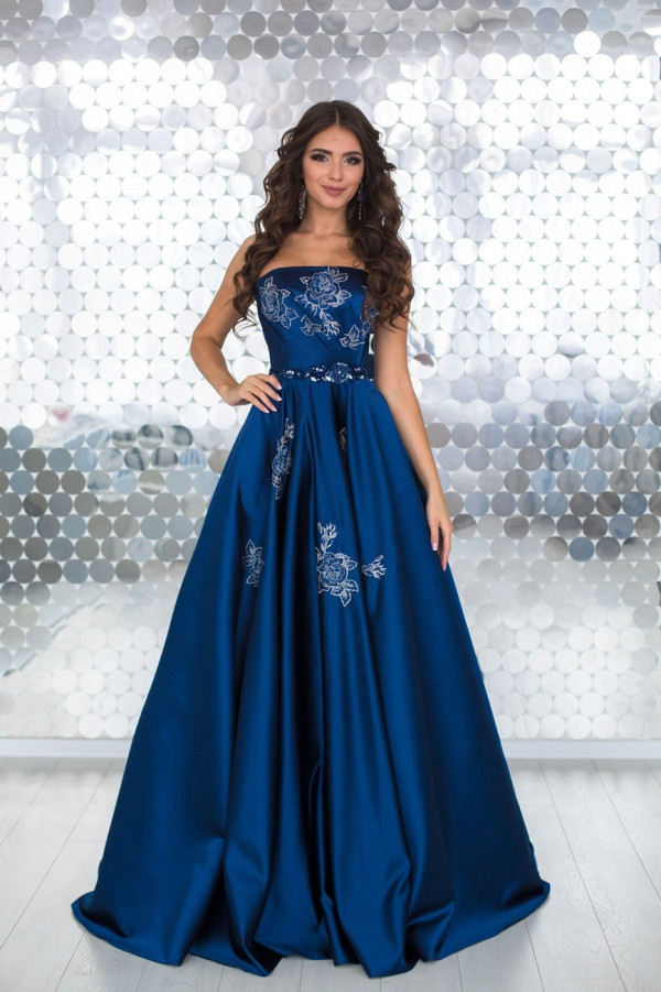 Корсет платья украшает ассиметричная драпировка из основной ткани и вышивка 3D цветами,которые переходят на юбку .
