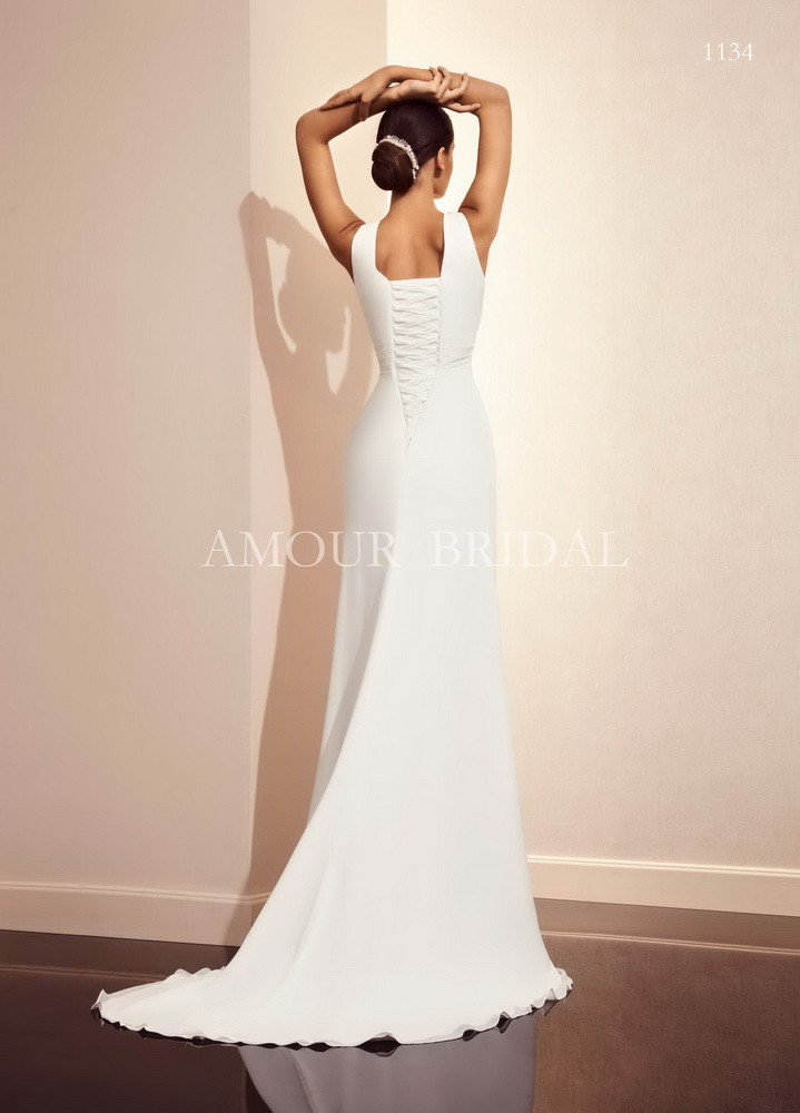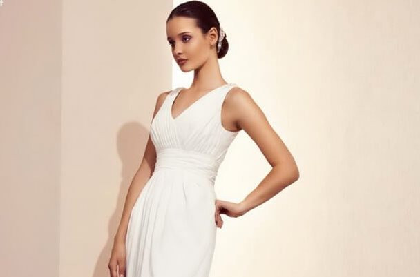 Это платье для тех, кто любит простоту. В нем нет ничего лишнего. Драпировка на лифе с V-образным вырезом лаконично переходит в защипы на юбке. Удлиненная шнуровка создает точеный силуэт.