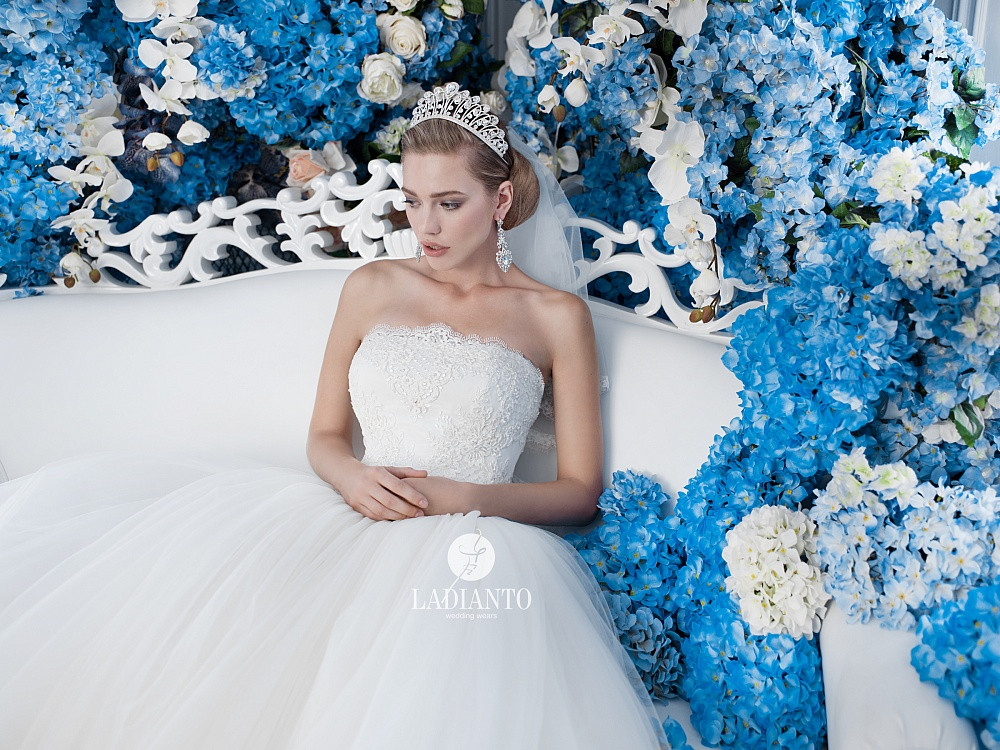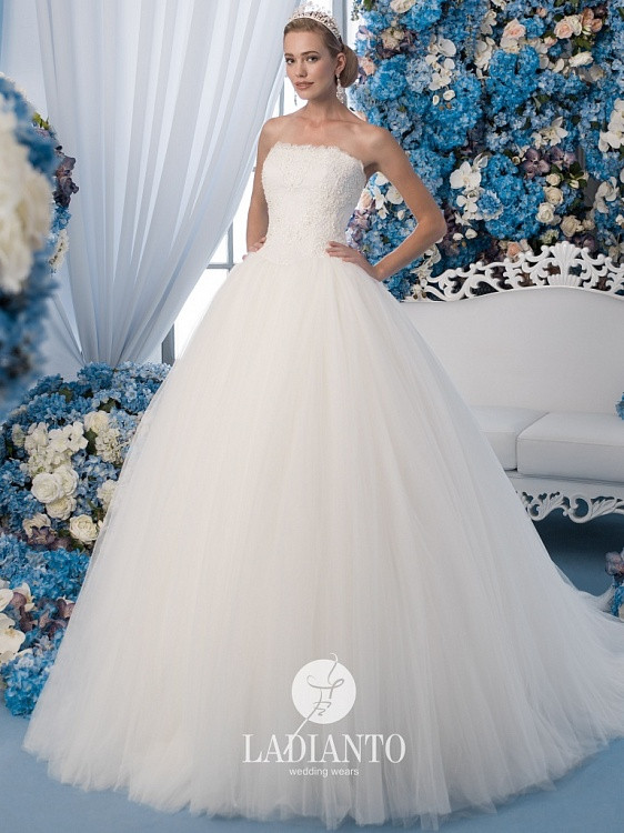 Пышное свадебное платье, юбка из струящегося еврофатина со шлейфом. Вырез корсета прямой, тонко украшен кружевными элементами. Также сам корсет украшен кружевными элементами, расшитыми паетками. Спина открытая на шнуровке. Юбка многослойная, подойдет на 4 или 5 колец.