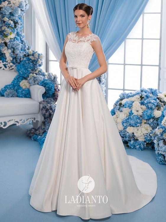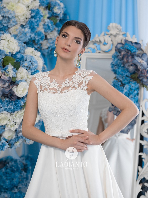 Свадебное платье А-образного силуэта, с атласной юбкой. Платье отрезное по линии талии, украшено тонким поясом-бантик. Вырез корсета прямой, майка расшита кружевными элементами, спинка на европейской пуговичной застежке. Юбка со складками, шлейф декорирован пуговицами.