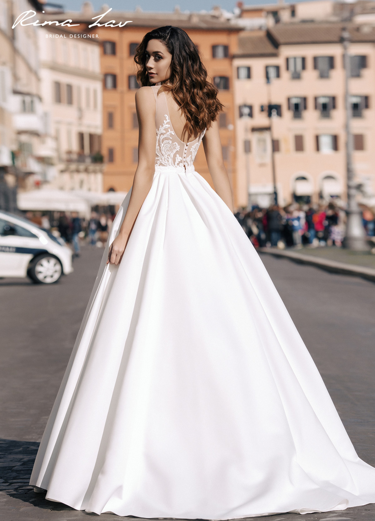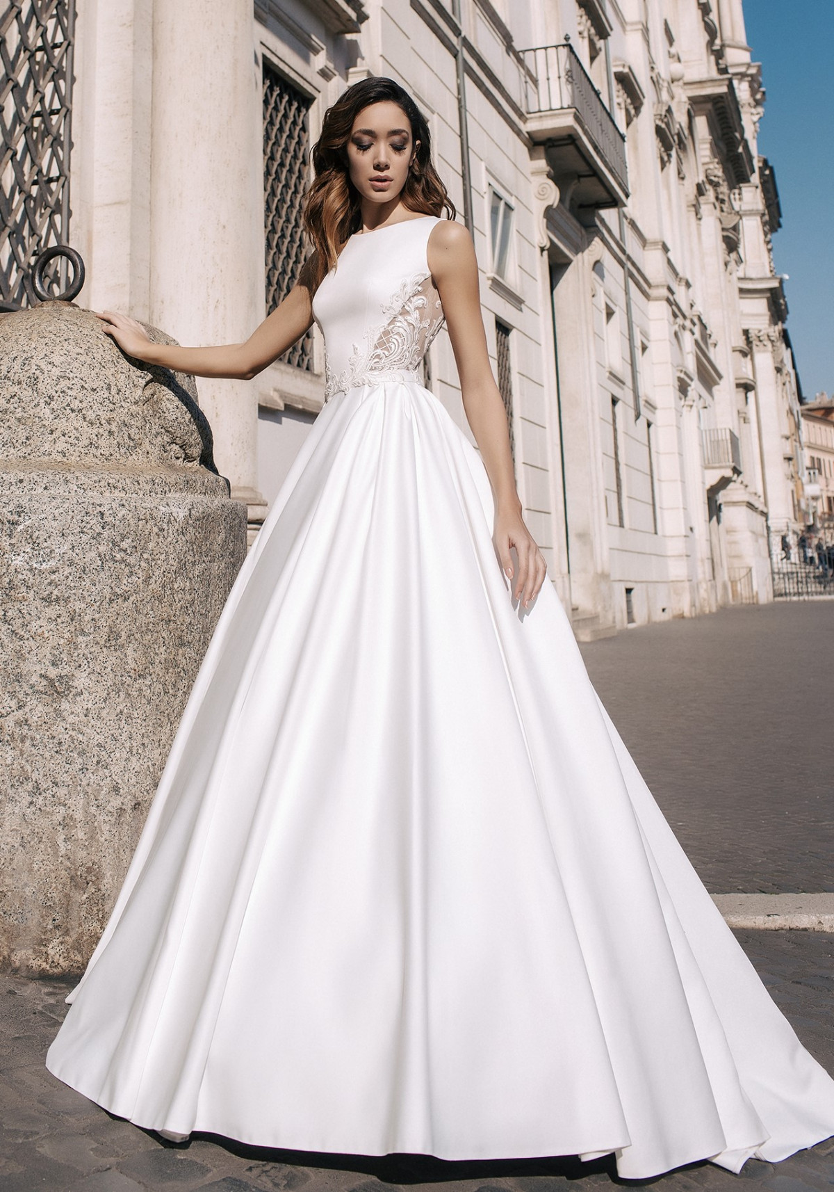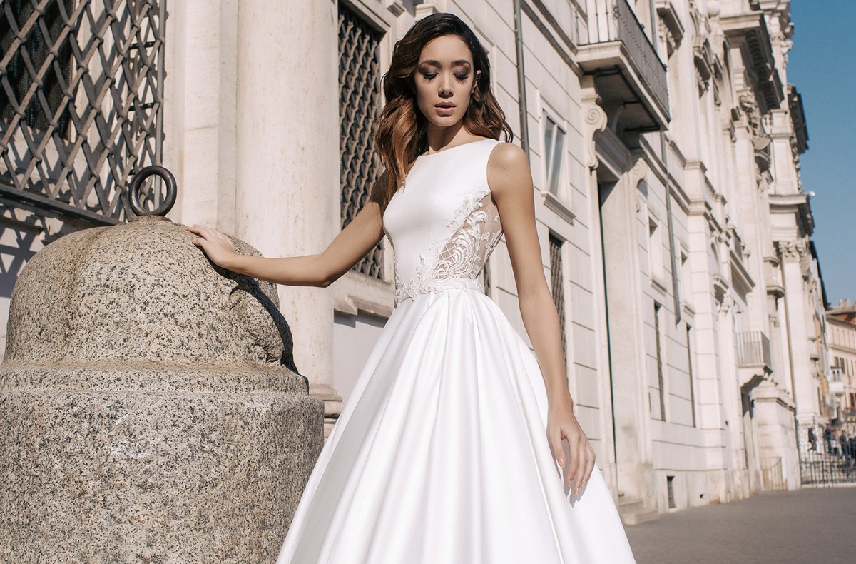Платье А-силуэта изысканного кроя из атласа молочного цвета. Прекрасный выбор для нежной и женственной невесты.