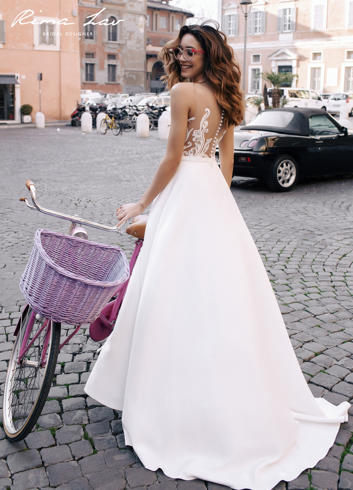 Платье А силуэта с кружевными вставками на талии и европейской пуговичной застежкой по спинке.