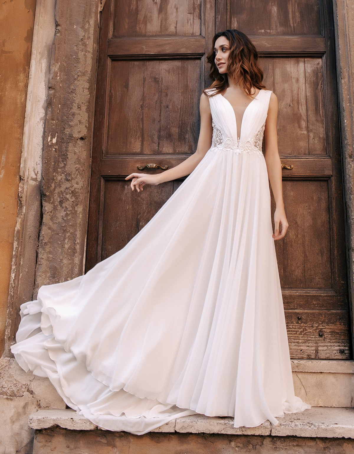 Летящая шифоновая юбка, глубокое декольте делают платье необыкновенно притягательным.